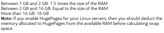 The VM has 116GB memory, and 32GB reserved for HugePages. The actual swap mountpoint is 4GB big and, based on the Oracle Server Configuration Checklist for 19c, the swap mountpoint should be in this case 16GB.